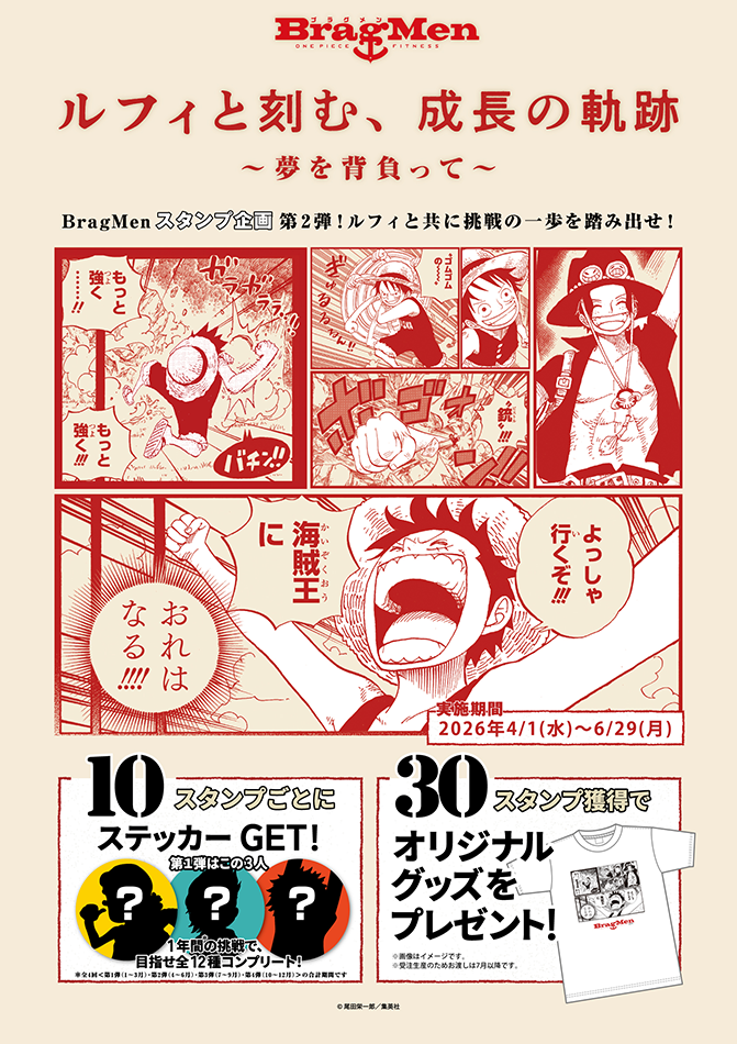 日々のトレーニングを積み重ね、「ルフィと共に成長しよう!」をコンセプトに1年を通して“成長の軌跡”を刻んでいく、BragMenならではのスタンプ企画です。